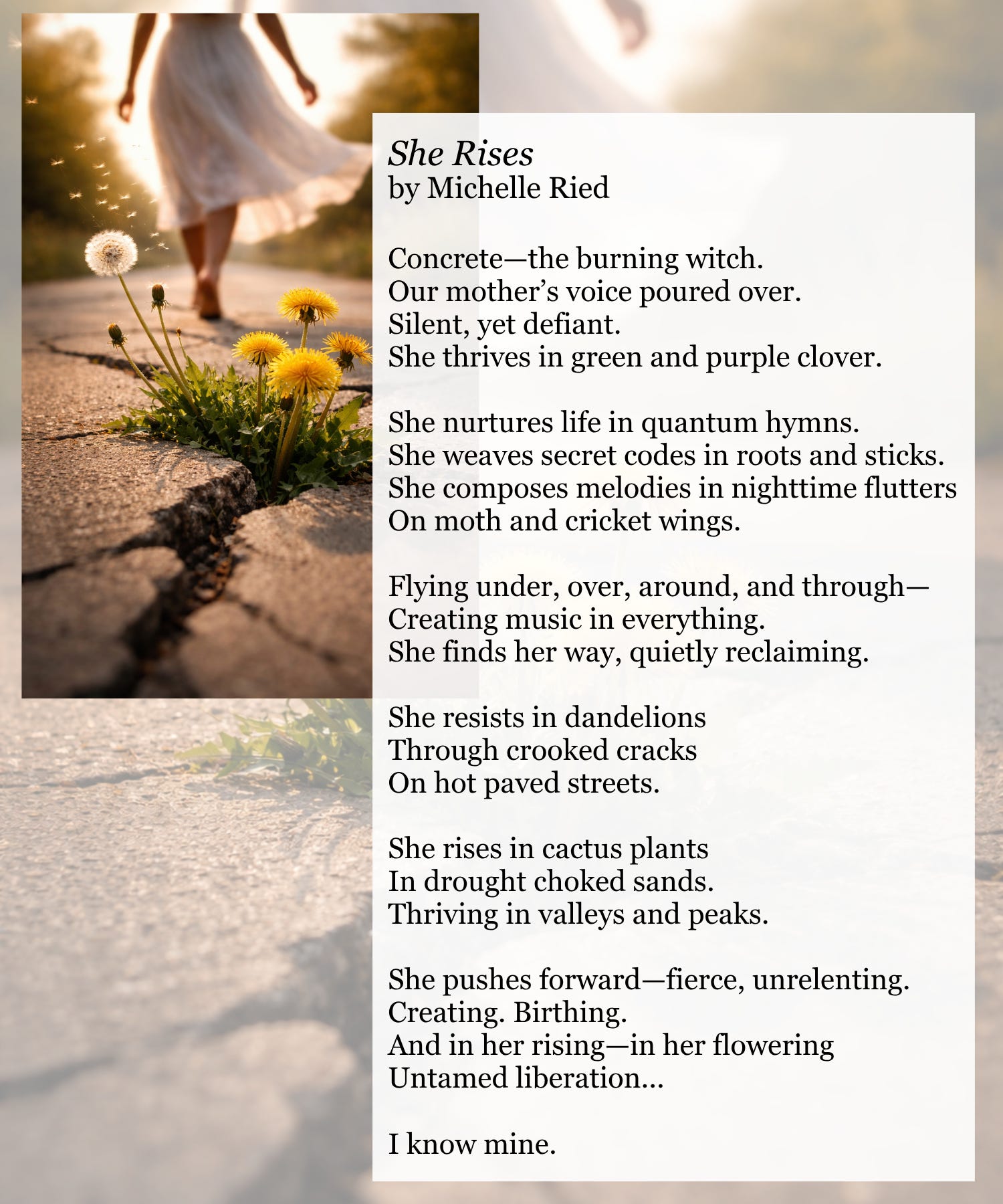 She Rises is written in that language—ecopoetic, feminine, grounded in the earth’s own syntax of resistance and renewal. She is the dandelion in the sidewalk crack. She is the cactus in the sand. She is the moth and the cricket and the root system threading its secret codes beneath everything we have paved over and called permanent. She is not loud about it.