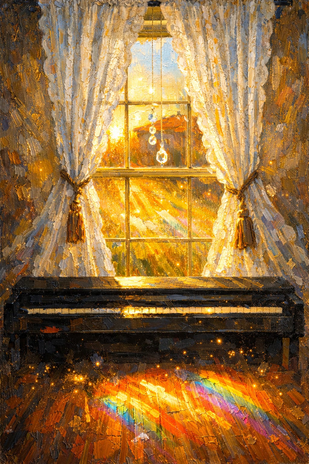 In step, my broom and I waltz with the glow. Rainbow slivers circle in a meditative dance around the room. The magic of care fills empty space. My mind quiets as the room clears of what the week left behind.